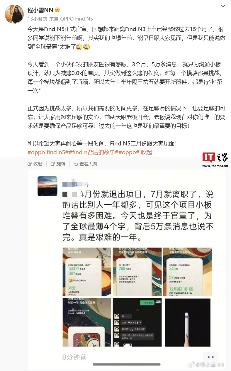 IT之家 1 月 14 日消息,OPPO Find N 产品经理 @程小雪NN 昨日发文称,Find N5 距前代上市已过去 15 个月,想年前跟用户见面,但做到“全球最薄”太难了。