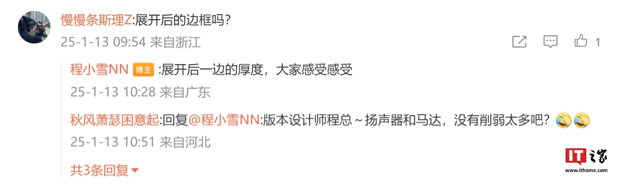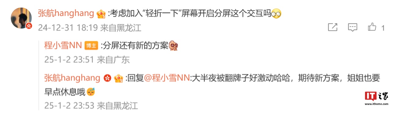IT之家注意到,@程小雪NN 还透露了新机部分信息:针对官宣图是否为展开后的边框厚度,她称“展开后一边的厚度,大家感受感受”;针对开启分屏操作是否有新交互,她表示“分屏还有新的方案”。