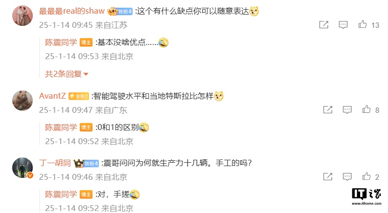 不过,该博主在视频下方评论区中回答了一些问题,表示“基本没啥优点……”,而智能驾驶水平和当地特斯拉比是“0 和 1 的区别”,并称该车是“手搓”的。
