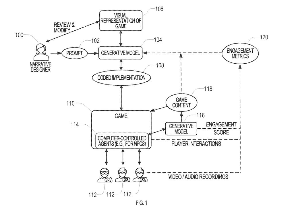 专利概述了 AI 迭代游戏的方式,例如根据指令快速生成与叙事相关的对象。以《我的世界》(Minecraft)为例,玩家可以输入指令,实时创建新的游戏规则、系统、非玩家角色(NPC)或叙事内容。