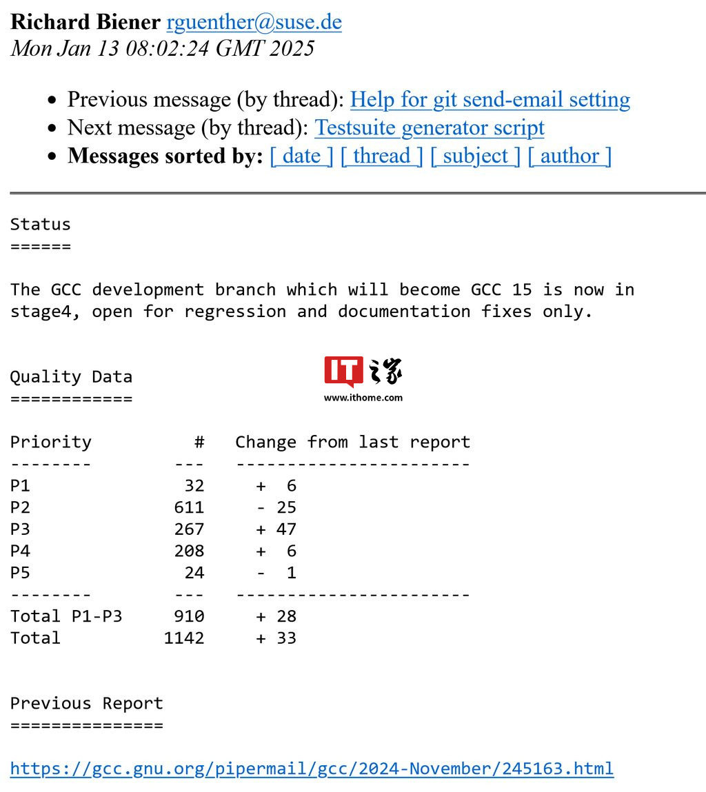 IT之家 1 月 14 日消息,科技媒体 phoronix 昨日(1 月 13 日)发布博文,报道称 GCC 15 编译器进入最后开发阶段,专注于修复 BUG 和更新文档,预计 2-3 个月内发布稳定版 GCC 15.1。