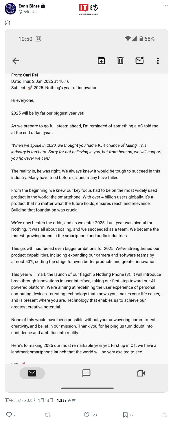裴宇在电子邮件中,确认会在 2025 年发布 Nothing Phone(3)手机,并表示作为 Nothing 品牌迈向 AI 驱动平台的第一步,强调该款旗舰手机将在用户界面方面带来突破性创新。Nothing 希望通过 AI 赋能产品,帮助用户最大限度地发挥创造力。IT之家附上截图如下: