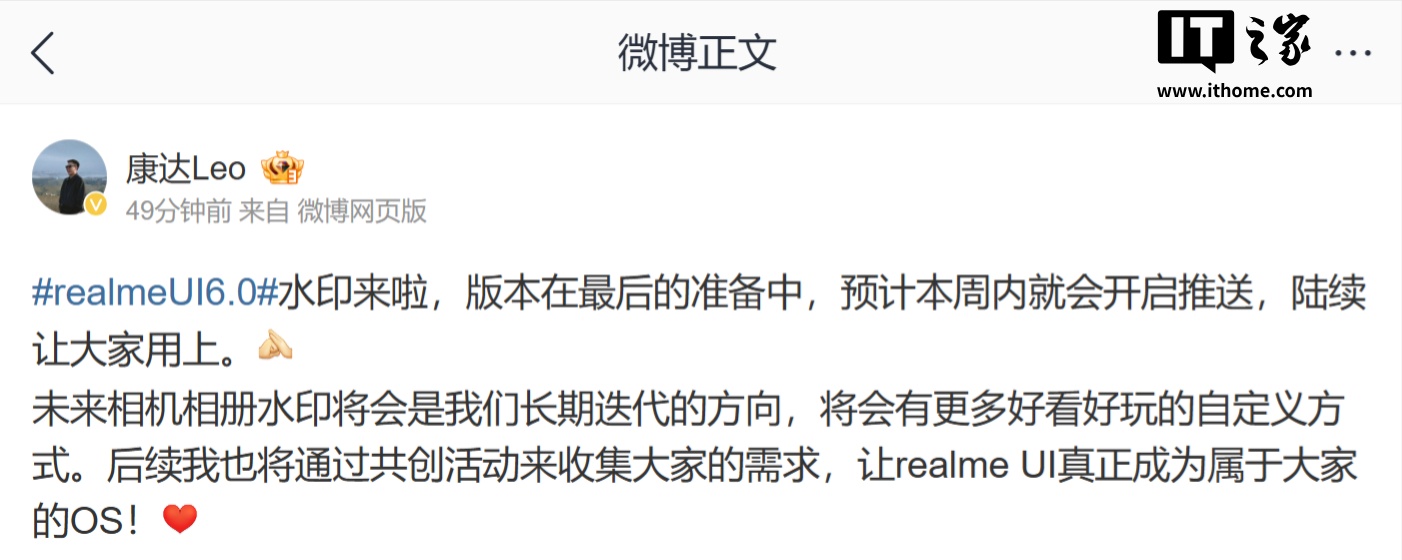 IT之家 1 月 14 日消息,realme UI 产品经理 @康达 Leo 今日宣布,realme UI 6.0 水印上新,版本在最后的准备中,预计本周内开启推送。