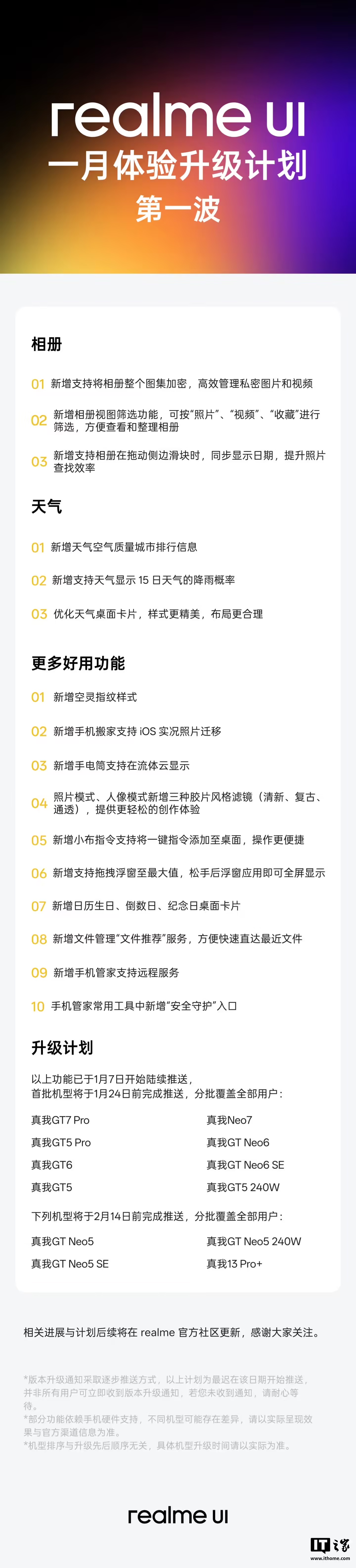 据IT之家此前报道,真我本月还公布了 realme UI 的 1 月体验升级计划。官方称团队正全力优化系统性能,逐步扩大适配机型范围,计划新增支持将相册整个图集加密、手机搬家支持 iOS 实况照片迁移等功能。