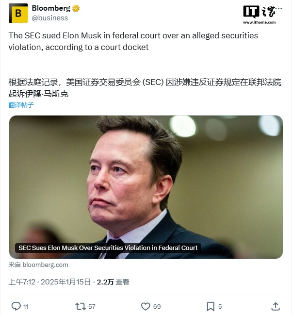 IT之家 1 月 15 日消息,美国证券交易委员会(SEC)已在华盛顿特区联邦法院起诉埃隆・马斯克,指控其在收购推特(后改名 X)之前未能及时披露其大量购买该公司股票的行为(涉嫌违反证券法)。