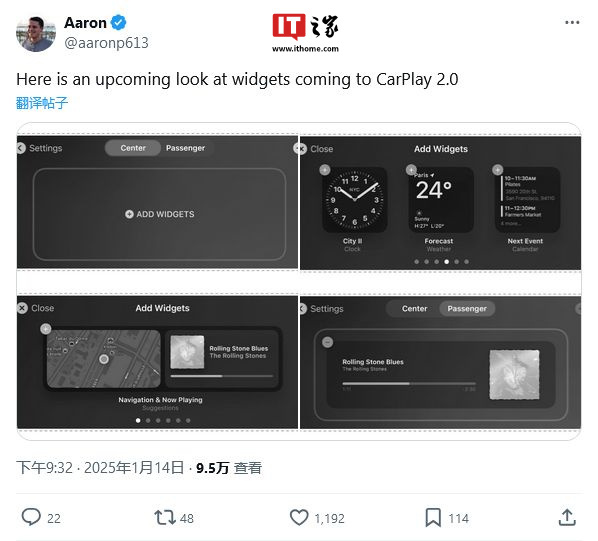 IT之家 1 月 15 日消息,科技媒体 MacRumors 撰稿人 Aaron Perris 挖掘欧盟数据库,发现了苹果 CarPlay 2.0 的一些设计截图,主要展示了自定义小组件的界面。
