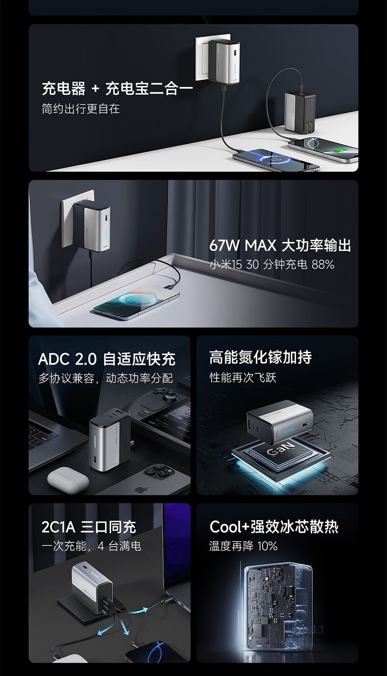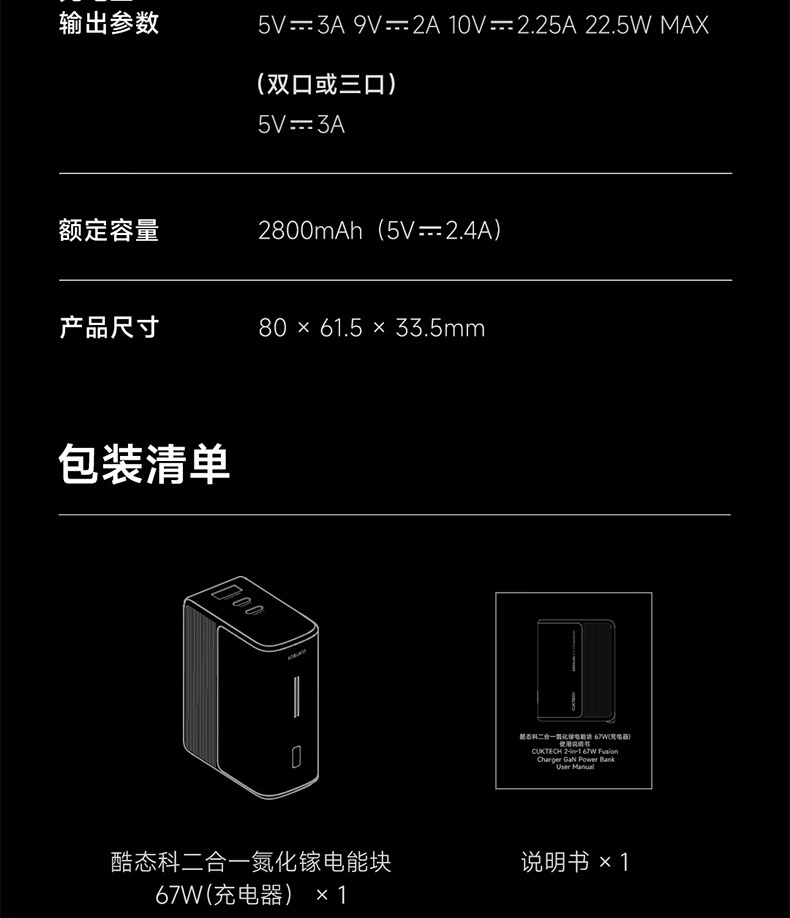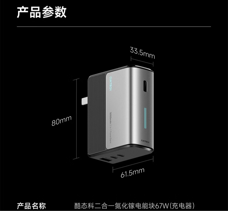 据介绍,酷态科 CP16 电能块采用充电器和充电宝二合一设计,支持最大 67W 功率输出,配备“2C1A”三口,辅以可折叠插脚设计,电池容量 17.64Wh / 18Wh,可上飞机。