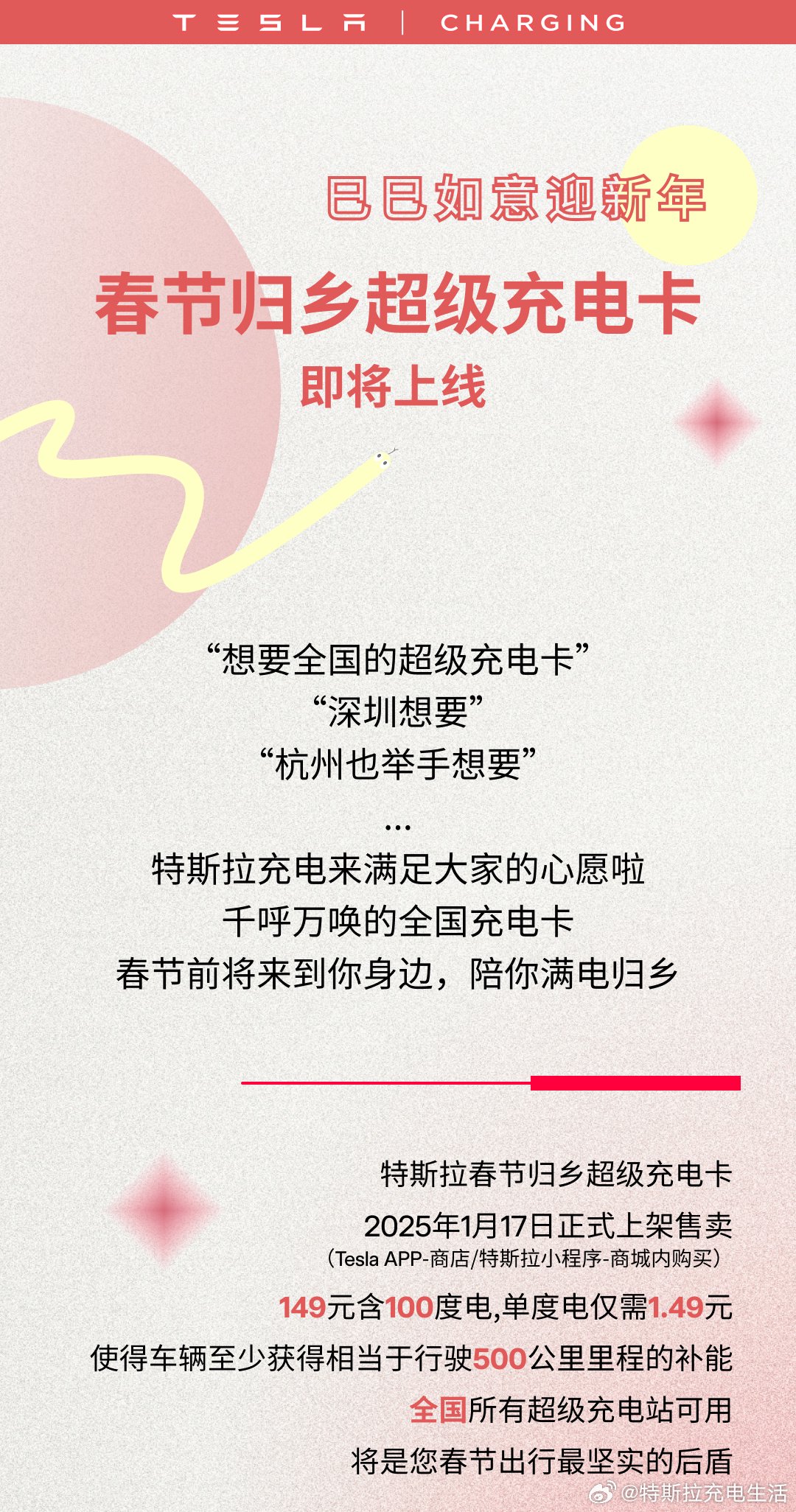 IT之家从特斯拉官方宣传海报获悉,“春节归乡超级充电卡”将于 2025 年 1 月 17 日上架售卖(Tesla App-商店 / 特斯拉小程序-商城),149 元含 100 度电、单度电 1.49 元,全国所有超级充电站可用。