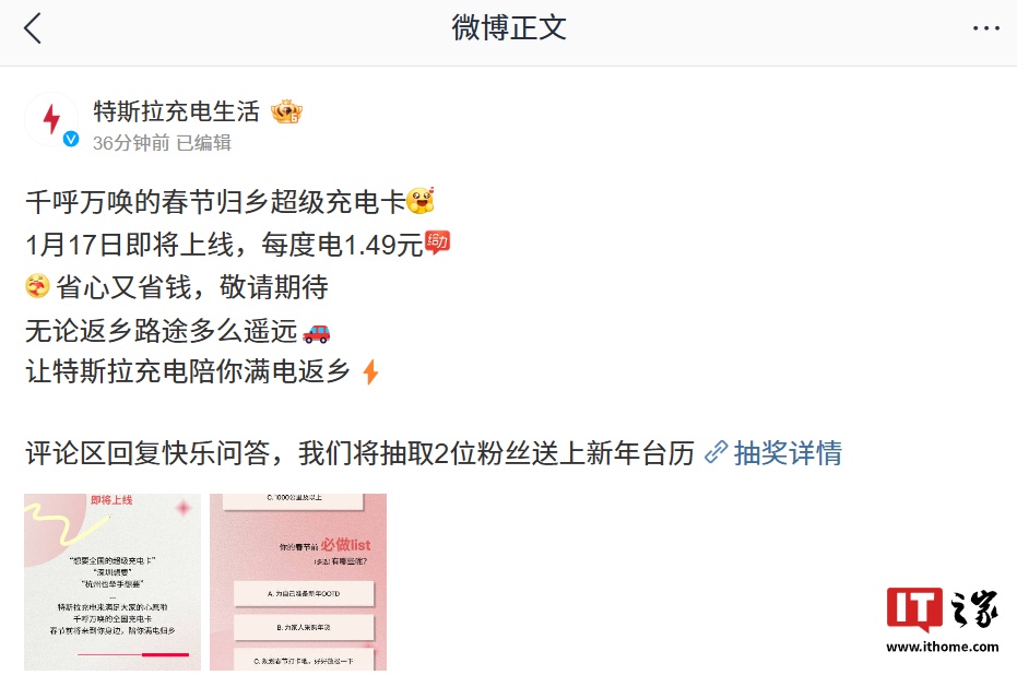 IT之家 1 月 15 日消息,特斯拉充电官方今日发文宣布,特斯拉“春节归乡超级充电卡”将于 1 月 17 日上线,宣称“每度电 1.49 元”。