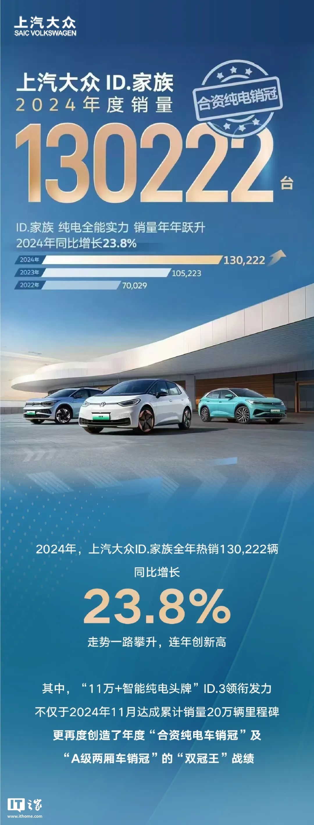 据IT之家此前报道,上汽大众 ID. 家族 2024 年销量超 13 万辆,同比增长 23.8%,拿下“合资纯电销冠”。上汽大众表示:“2025 年已经满电启程,ID. 家族将‘听劝’进行到底,新的一年里聚焦设计升级和智能升级”。