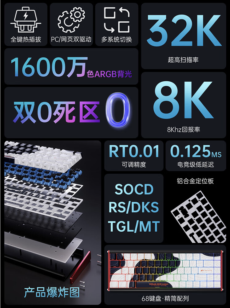 规格方面,系列键盘具备 0.01mm 的精度、32K 扫描率,支持 RT0.01-2.0mm 多键程可调。键盘可选磁稻轴 HIFI 版 / 科泰水瓶座磁轴,支持全键热插拔、全键无冲特性。