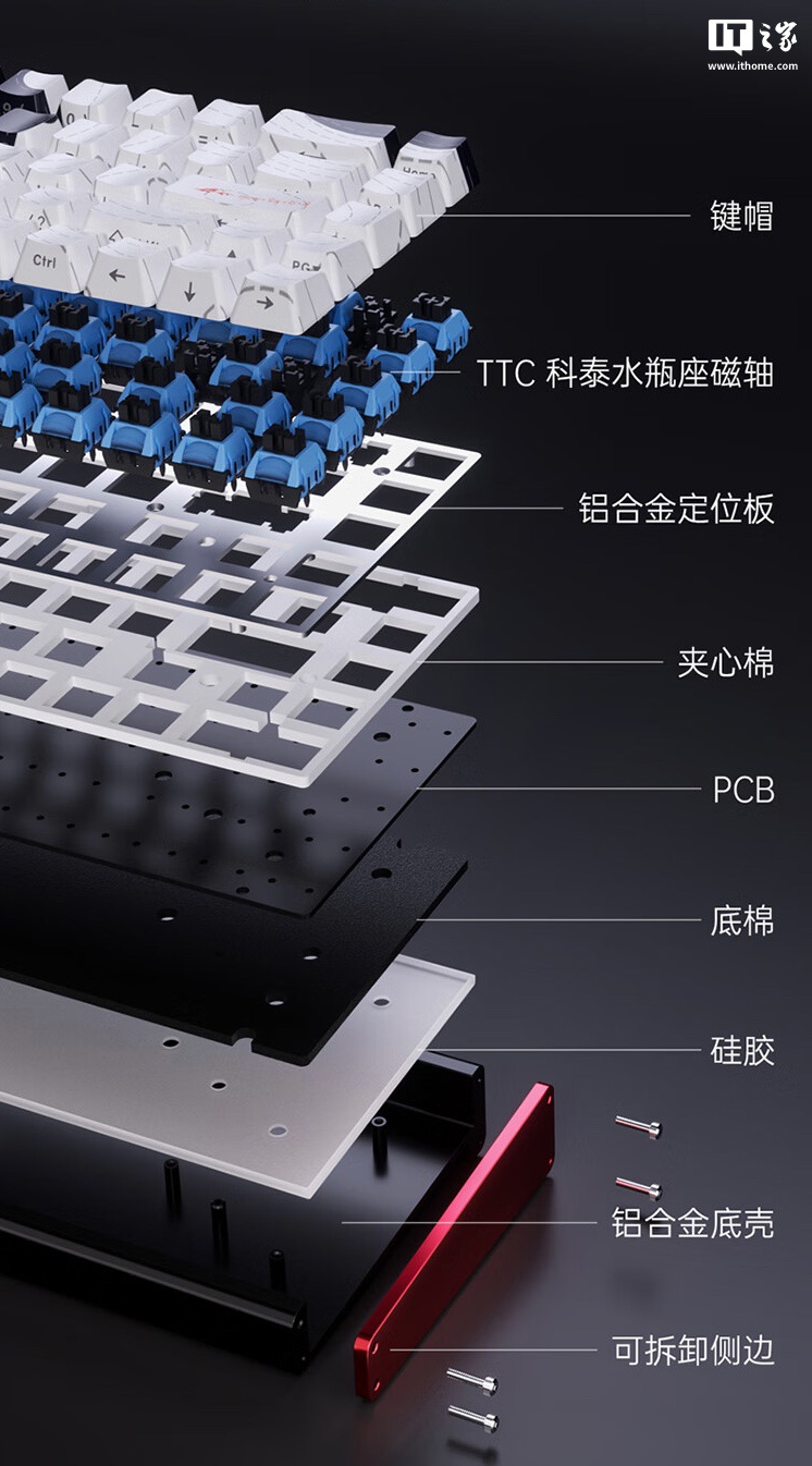 据介绍,系列键盘采用 6063 铝合金 CNC 外壳设计,表面经 180 目阳极氧化工艺处理,键盘支持侧板可替换,整体使用船壳结构,其中磁稻轴 Hi-Fi 轴版为 1KHz 回报率,其他轴体均为 8KHz 回报率。