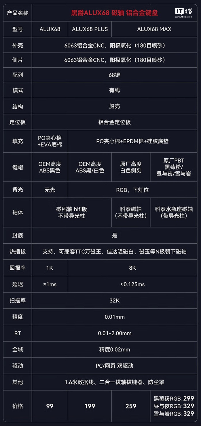 黑爵 ALUX68 系列磁轴机械键盘各版本售价情况如下: