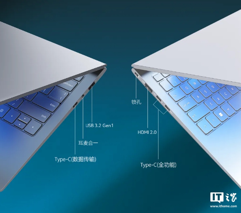 新机配有 60Wh 电池 + 100W PD 快充,标称续航 12 小时;三档背光键盘、Wi-Fi 6、前置摄像头,IT之家附接口图如下: