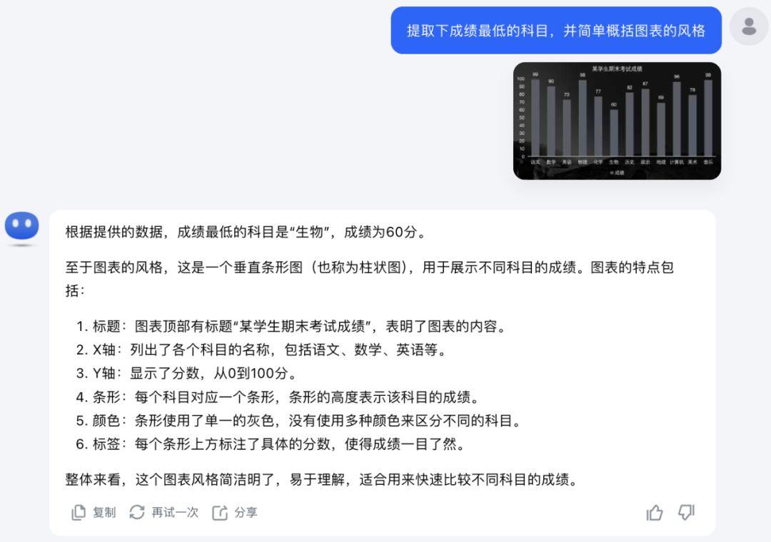 以这张《某学生期末考试成绩》柱状图为例,官方让模型提取分析考试成绩,并从美学风格的角度分析一下该柱状图。Vision 模型也能够精准地识别出柱状图中每个科目名称对应的分数数值并做分数对比,同时可以识别出该柱状图的样式格式和颜色等。