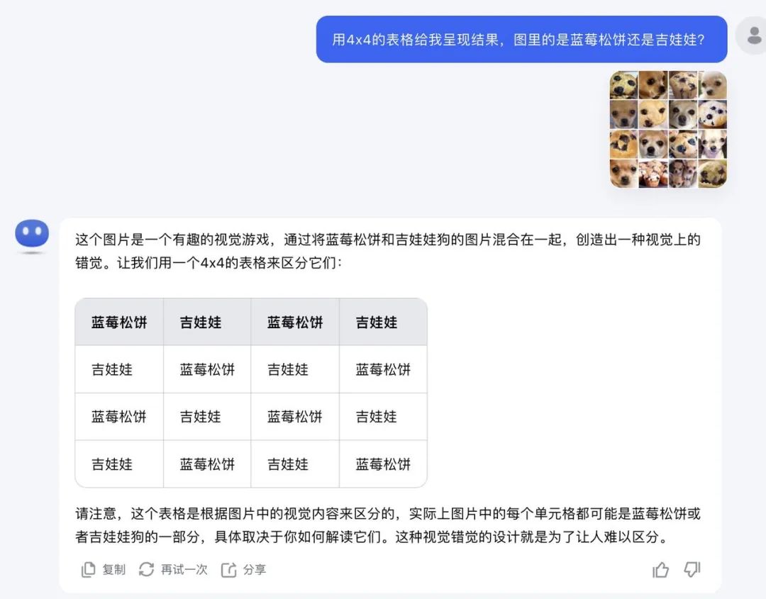 下图示例中,官方拼凑了 16 张相似的人眼较难区分的蓝莓松饼和吉娃娃图片,由 Vision 模型来识别并按顺序标记图片类型,无论是蓝莓松饼还是吉娃娃,模型都能精确地区分和识别。
