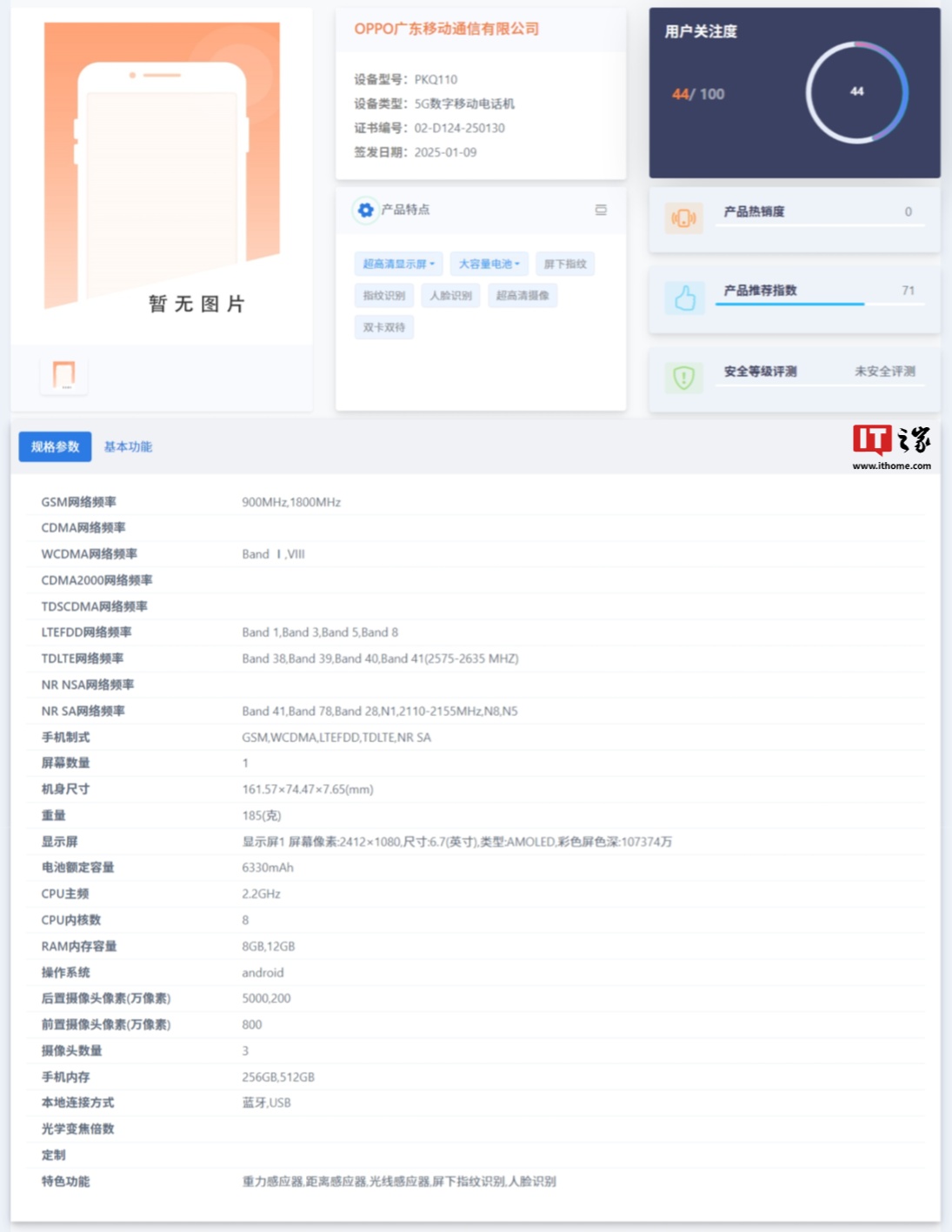 OPPO“PKQ110”新机还现身电信设备终端网,配备 6.7 英寸 2412×1080 分辨率屏幕(色深:107374 万),内置 6330mAh 电池,CPU 主频 2.2GHz。
