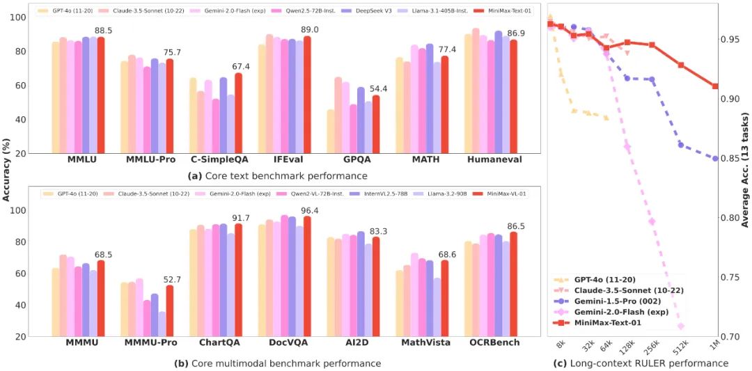 在长文任务上,随着输入长度变长,MiniMax-Text-01 性能衰减更少,显著优于谷歌 Gemini。因此,01 系列模型在处理长输入的时候有非常高的效率,接近线性复杂度。