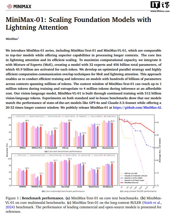 IT之家 1 月 15 日消息,稀宇科技(MiniMax)今日宣布推出新一代 01 系列模型,包含基础语言大模型 MiniMax-Text-01 和视觉多模态大模型 MiniMax-VL-01。