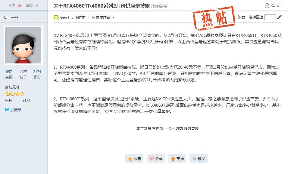 今天有渠道商在博板堂爆料称,RTX 4070 以及以上型号预计可于 1 月份全部清完库存。从 2 月份开始,各大核心 AIC 厂商预计只剩 RTX 4060Ti、RTX4060 两个型号还有库存仍待消化。