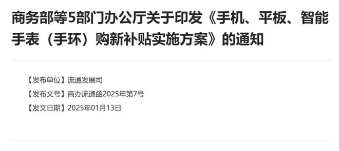 手机、平板、智能手表(手环)购新补贴实施方案明确,个人消费者购买单件销售价格不超过 6000 元的手机、平板、智能手表(手环)3 类数码产品,可享受购新补贴。每人每类可补贴 1 件,每件补贴比例为减去生产、流通环节及移动运营商所有优惠后最终销售价格的 15%,每件最高不超过 500 元。各地将根据该方案细化实施细则,1 月 20 日起全国实施。