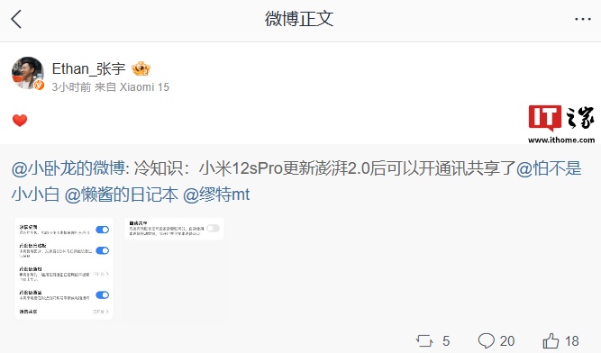 IT之家注意到,小米 REDMI 手机市场经理张宇今日转发了一位用户的微博,该用户称小米 12S Pro 手机升级澎湃 HyperOS 2 还支持通信共享功能(该更新点在更新日志中未提及)。