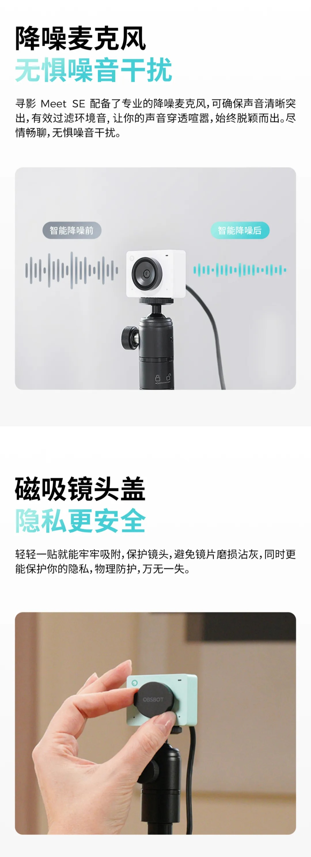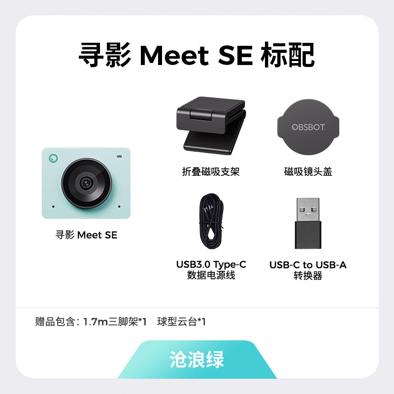 寻影 Meet SE 搭载 1/2.8 英寸 CMOS,支持 HDR;配备降噪麦克风;标配磁吸镜头盖,可避免镜头沾灰同时保护隐私。