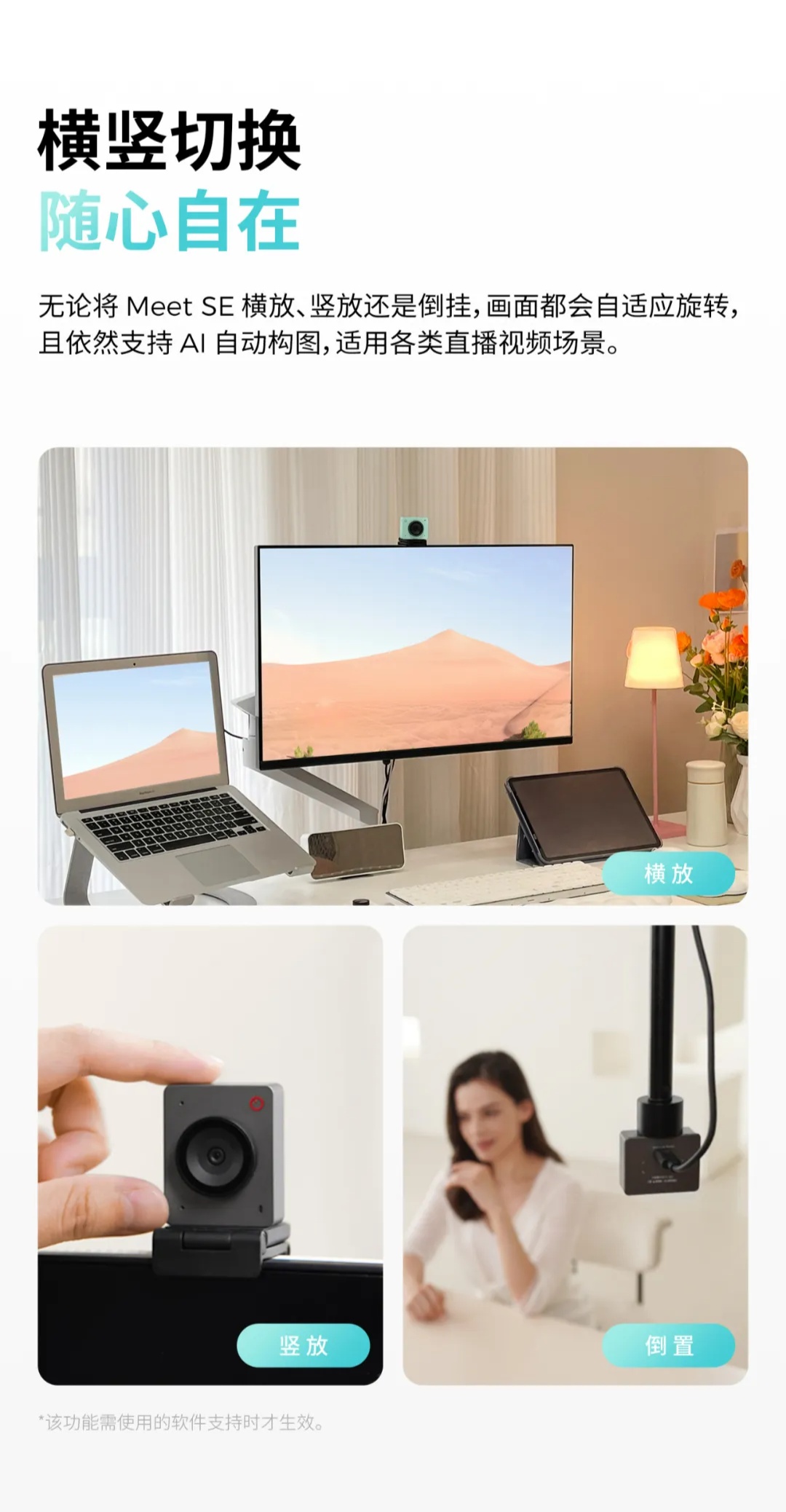 寻影 Meet SE 采用自动对焦技术。官方宣称无论是展示静态物体还是精准捕捉移动中的人物,寻影 MeetSE 都能“疾速自动对焦”;支持 AI 自动构图,自带美颜功能;画面支持自适应旋转,横放、竖放、倒置均可(需使用软件支持)。