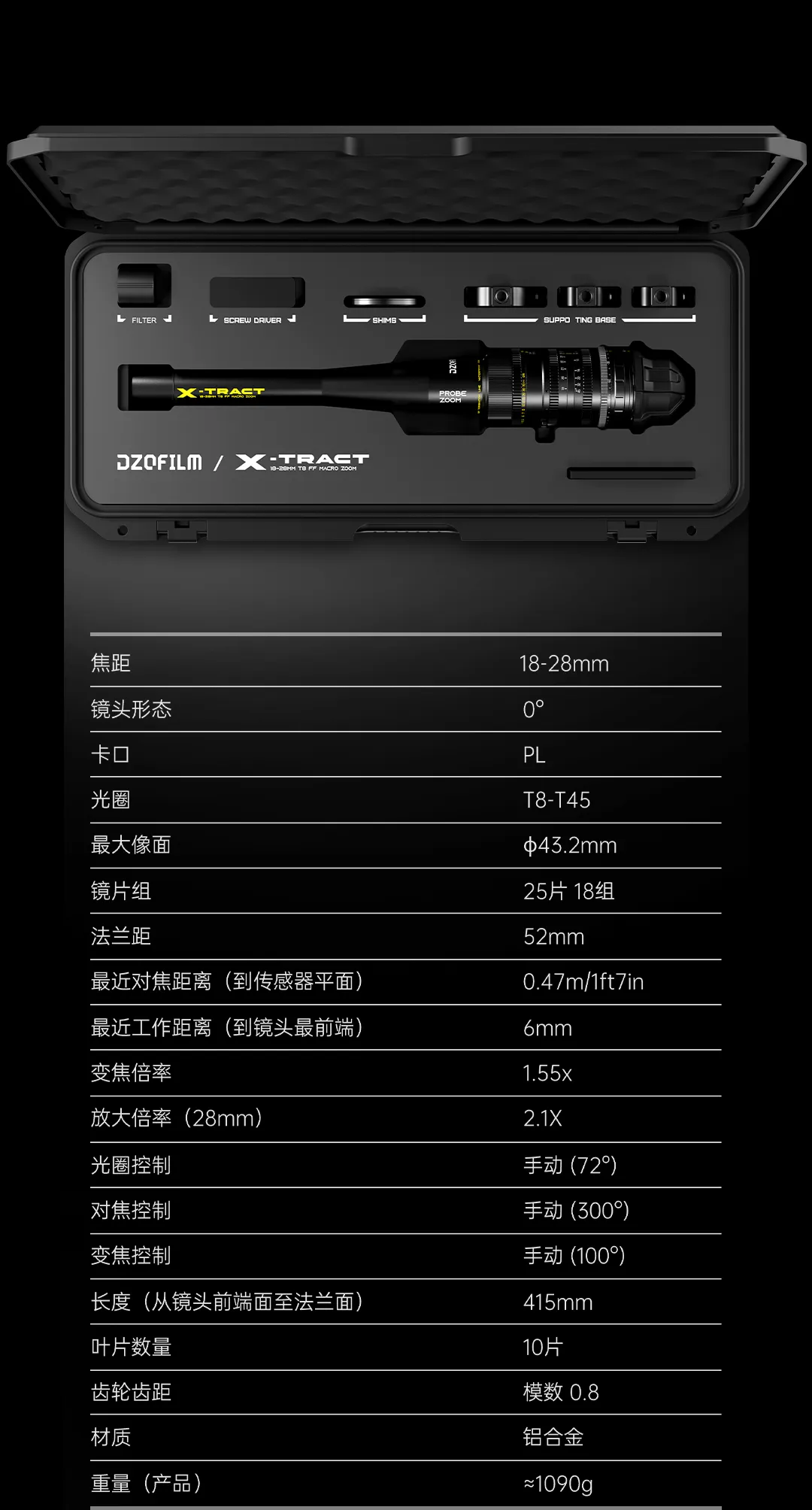 这款镜头采用齐焦设计,能够在变焦过程重锁住焦点;原生 PL 卡口(未来支持更换 EF 卡口);覆盖全画幅相机,向下兼容 S35 画幅。