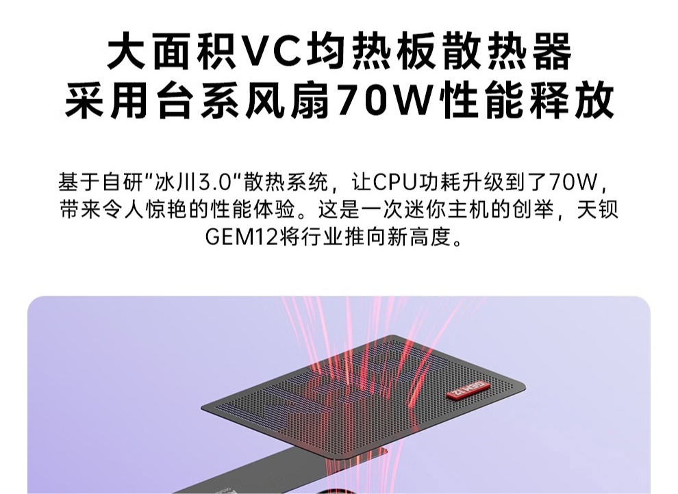 天钡 GEM12 Max 迷你主机搭载锐龙 R7-8745HS 处理器,8 核心 16 线程;搭载大面积 VC 均热板散热器,支持 70W 性能释放(需在 BIOS 中手动开启)。