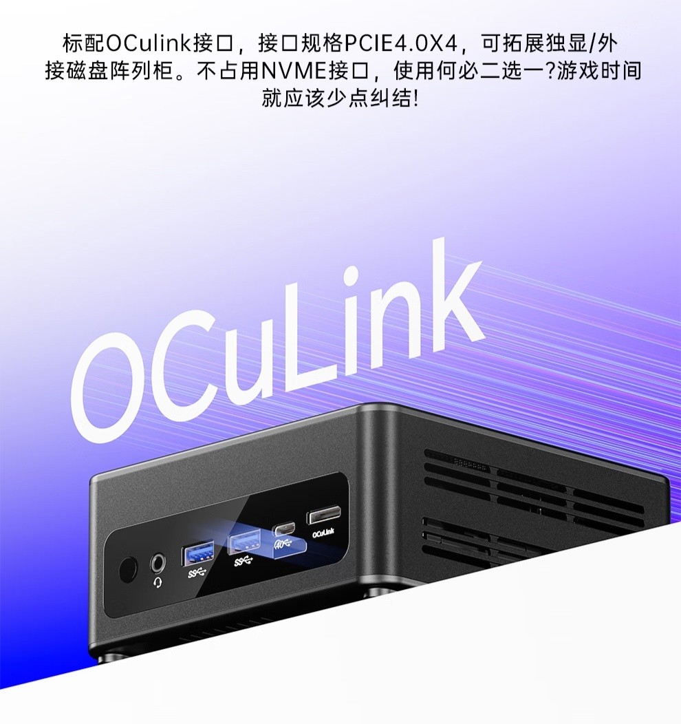 天钡 GEM12 Max 迷你主机标配 OCuLink 接口,PCIe 4.0×4 规格,不占用 NVME 接口。