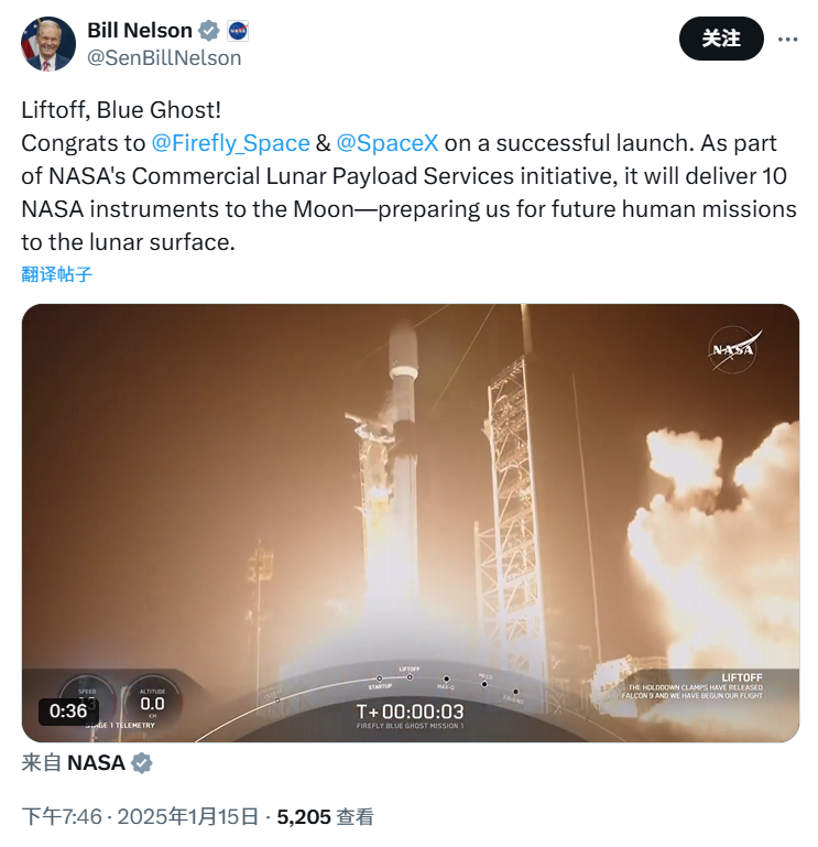 随后在北京时间今晚,比尔・纳尔逊发布了一条正确的推文,大意为“蓝色幽灵升空了!祝贺 @Firefly_Space 和 @SpaceX 成功发射。作为 NASA 商业月球有效载荷服务计划的一部分,它将向月球运送 10 台美国宇航局仪器,为我们未来的月球表面载人任务做准备。”