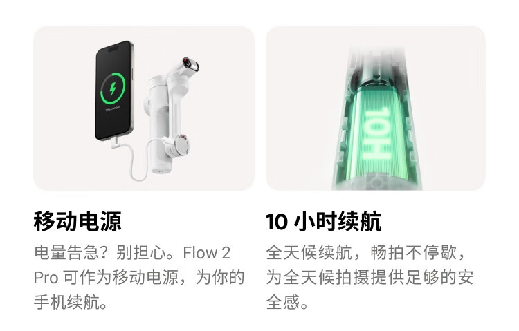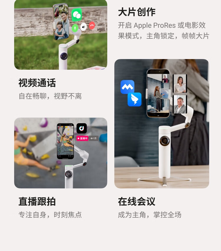相比前代,Insta360 Flow 2 Pro 手机稳定器新增支持动态长焦追踪、智能多人追踪、智能美学构图、自由俯仰模式等模式。