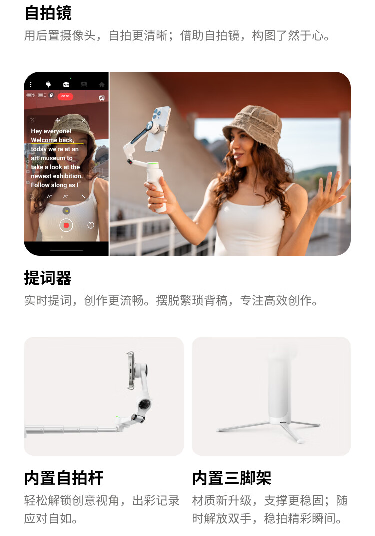 Insta360 Flow 2 Pro 手机稳定器新增自拍镜,可辅助构图,从而使用手机后摄自拍;内置自拍杆、三脚架,可用作移动电源。