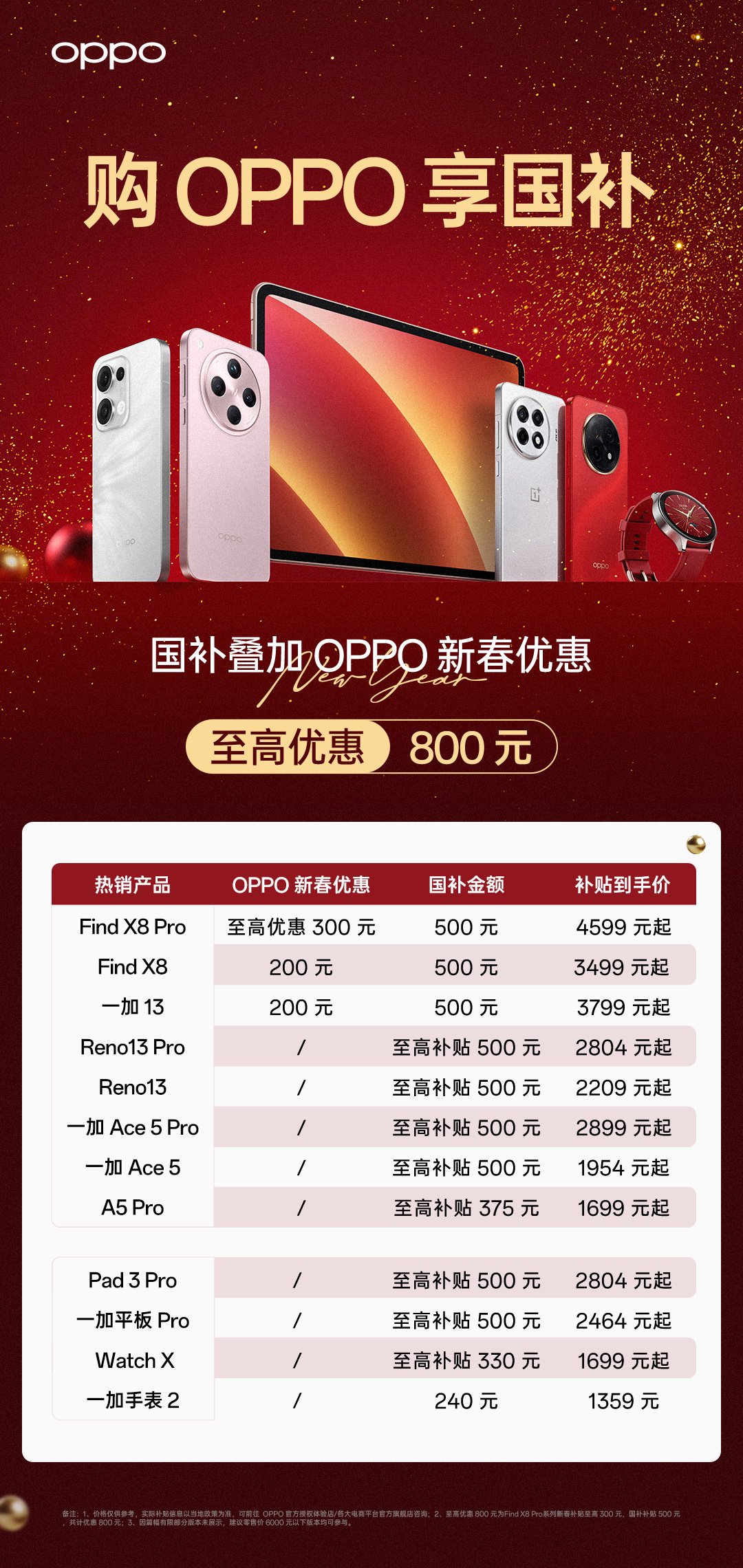 IT之家 1 月 16 日消息,OPPO 官方昨日发文宣布,1 月 20 号起购买 6000 元以下 OPPO 及一加手机 / 平板 / 手表全系产品,可享受 15% 补贴,至高优惠 500 元。另外,Find X8 系列、一加 13 系列可叠加官方新春优惠,至高优惠 800 元。