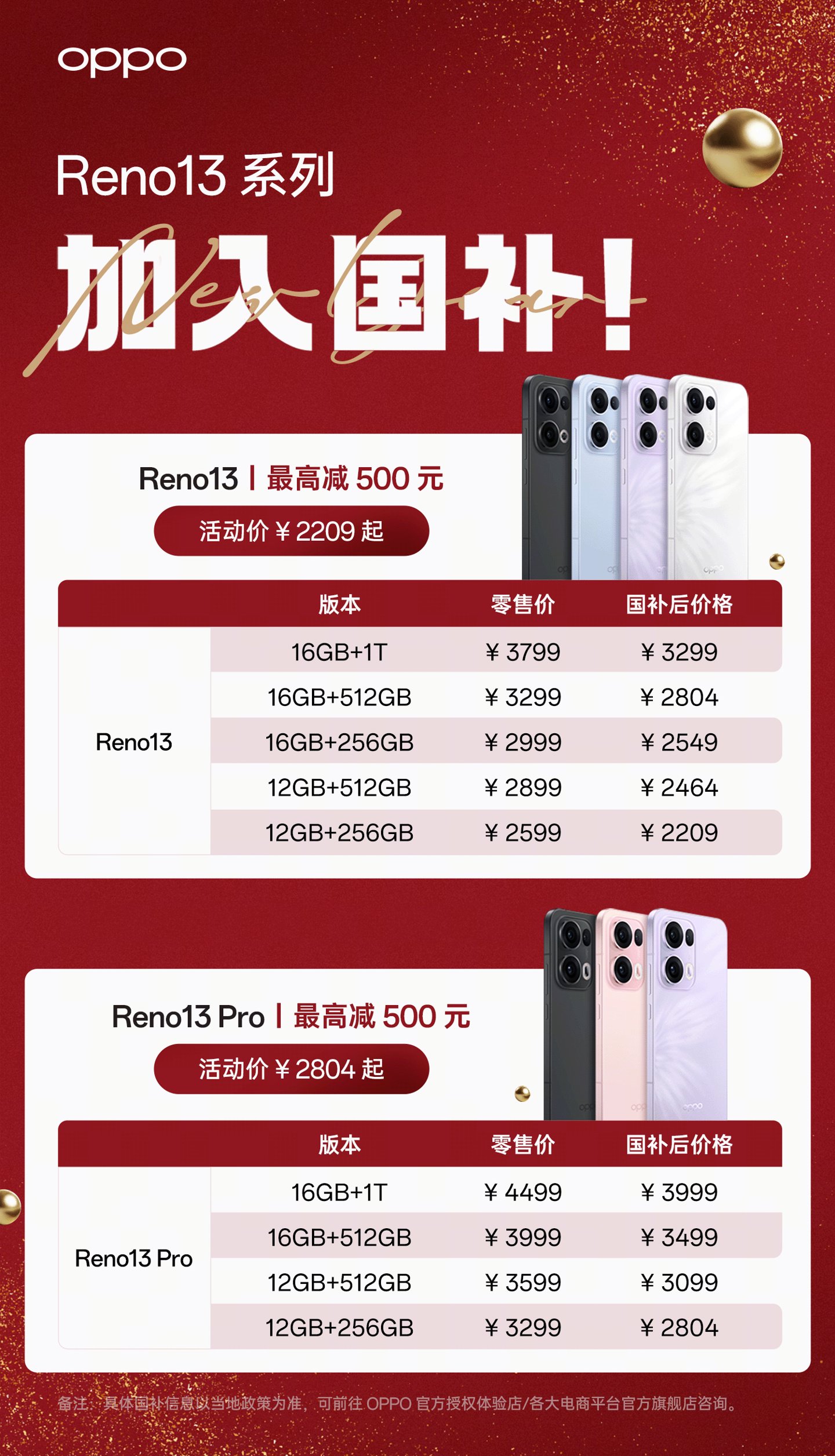 | Reno 13 | 16GB+1TB | 3799 元 | 3299 元 |