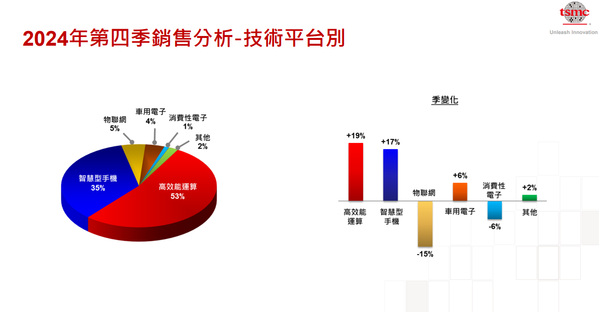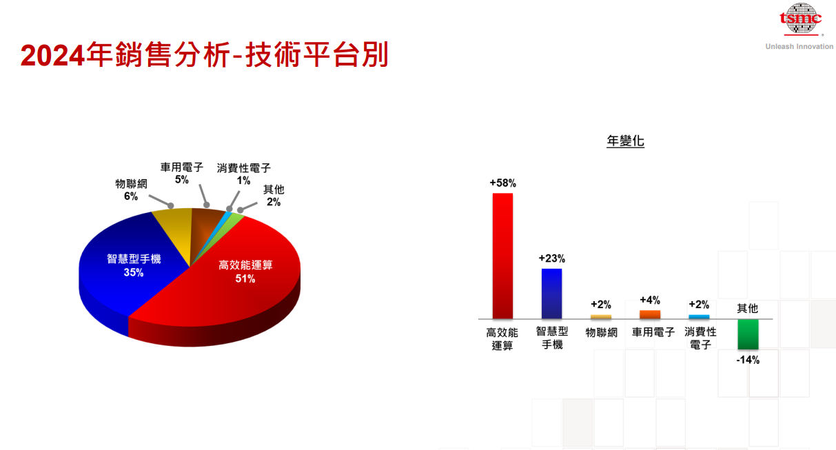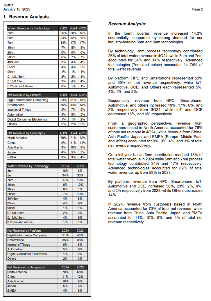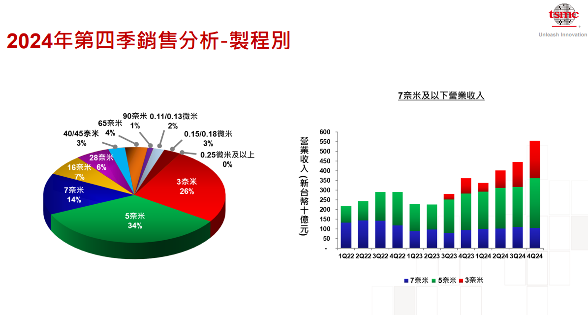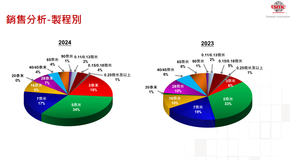 3nm 出货量占总晶圆收入的 26%;5nm 占 34%;7nm 占 14%,7nm 及更先进的技术总计占比 74%。