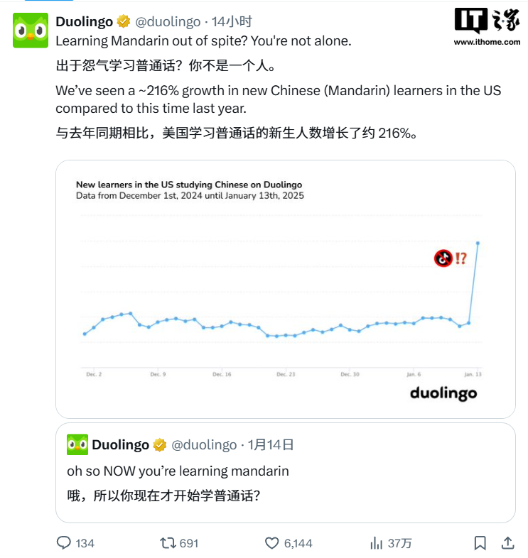 1 月 14 日,多邻国官方 X 账号调侃道:“哦,所以你现在才开始学普通话?”