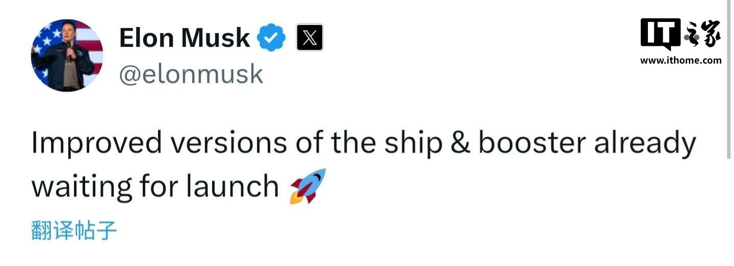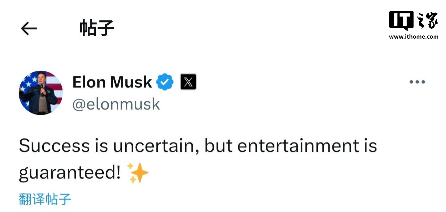IT之家 1 月 17 日消息,北京时间今日一早,SpaceX 新一代重型运载火箭“星舰”实施第七次试飞,第二级飞船失联。马斯克随后发文称:“成功是不确定的,但娱乐是有保证的!”他还写道,改进版星舰和助推器已准备就绪,等待发射。