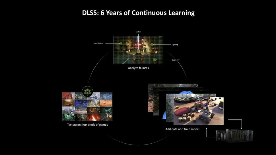 未来确保 DLSS 的改进效果,英伟达团队建立了一套完善的迭代流程,不断扩充训练数据,经过重新训练的模型会在数百款游戏中进行测试,不断循环分析、学习和改进,让 DLSS 技术不断进步。