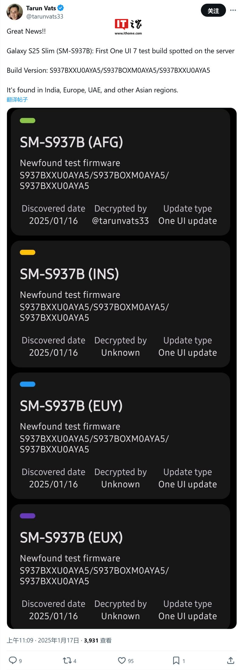 IT之家 1 月 17 日消息,消息源 @tarunvats33 今天(1 月 17 日)在 X 平台发布推文,曝料称在 CheckFirm 服务器上,发现了三星最薄旗舰 Galaxy S25 Slim 手机的首个 One UI 7 固件。