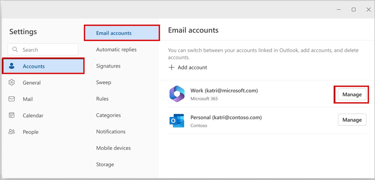 用户可以在 Outlook 设置 -> 账户 -> 你的账户 -> 管理中设置自定义描述,这将有助于用户更轻松地在 Outlook 文件夹列表、各种列表和菜单中识别他们的多个账户。