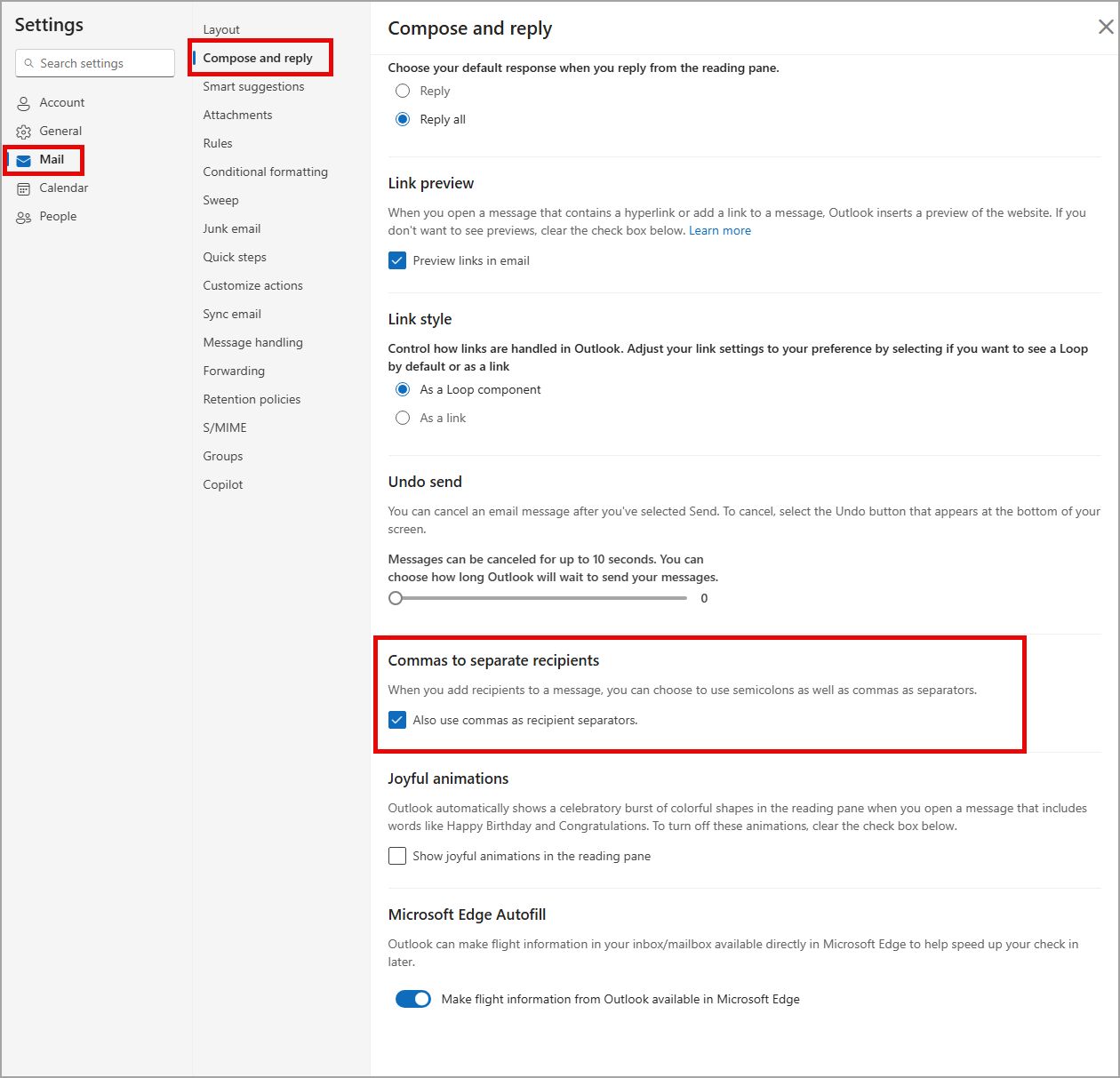 用户可在 Outlook 设置中更改默认设置:邮件 -> 撰写和回复 -> 使用逗号分隔收件人。默认情况下,逗号仍将作为分隔符。用户需要根据自身需求手动更改设置。此更新将自动完成,无需管理员提前操作。