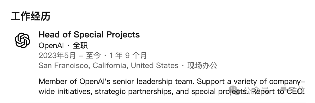 工作内容包括支持各种全公司范围的计划、战略合作伙伴关系和特别项目,直接向奥特曼汇报。