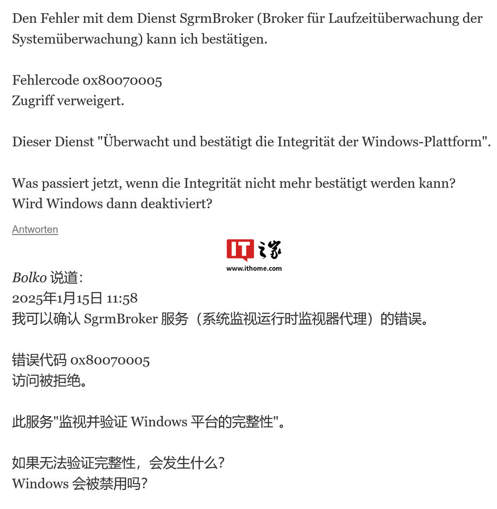 不过部分 Windows 10 和 Windows Server 2022 用户反馈,安装该 1 月更新 KB5049981 后,无法启动 SgrmBroker 服务,错误代码 0x80070005(拒绝访问)表明服务无法监控 Windows 的完整性。用户在卸载该更新后,SgrmBroker 服务恢复正常。