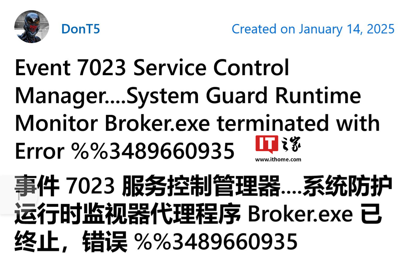 Microsoft Answers 论坛和 reddit.com 上,用户也确认了该问题。事件查看器中显示事件 ID 7023,错误信息为“System Guard Runtime Monitor Broker 服务因下列错误而终止: %%3489660935”,HP Omen 台式机和 HP Envy 笔记本电脑(Windows 10 22H2)均受影响。