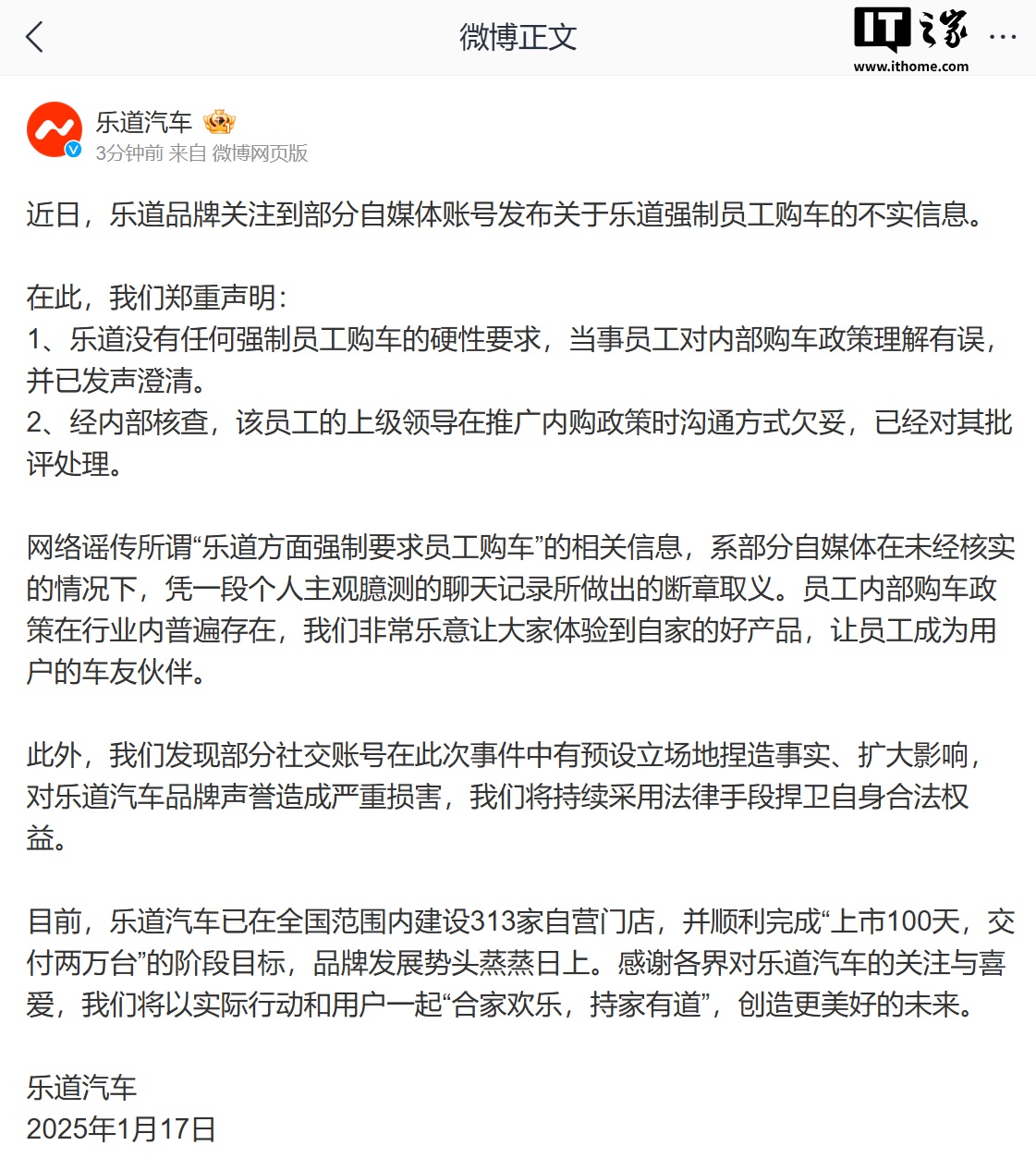 IT之家 1 月 17 日消息,乐道汽车今晚就“部分自媒体账号发布关于乐道强制员工购车的不实信息”一事发布声明。
