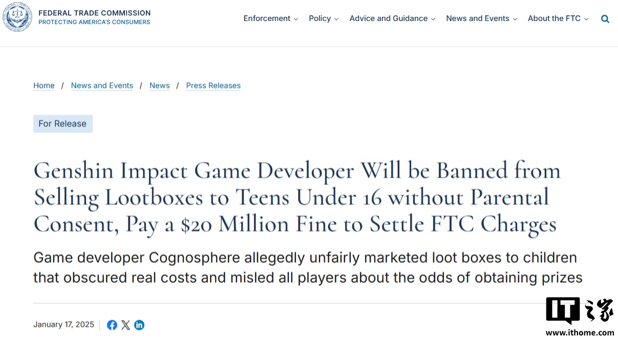 IT之家 1 月 18 日消息,当地时间周五,美国联邦贸易委员会(FTC)发布公告,称其已与《原神》开发商“米哈游”达成和解,原因是《原神》的抽卡机制涉嫌“欺骗性营销”并违反未成年人隐私保护法。