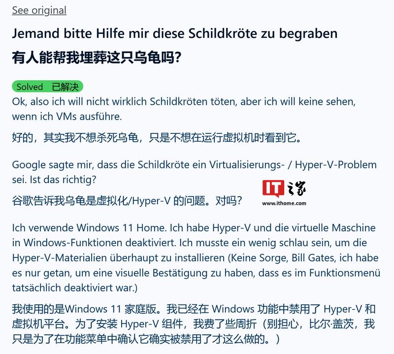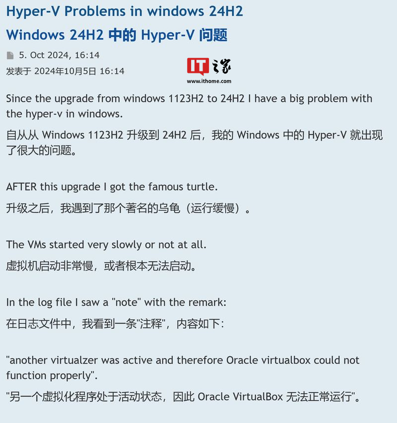 Virtualbox 社区中关于“Windows 24H2 中的 Hyper-V 问题”的讨论帖印证了这一问题。一位用户在将系统从 Windows 11 23H2 升级到 24H2 后,虚拟机启动速度变得非常缓慢,甚至无法启动,并显示“乌龟”符号,表明与其他虚拟化软件存在冲突。