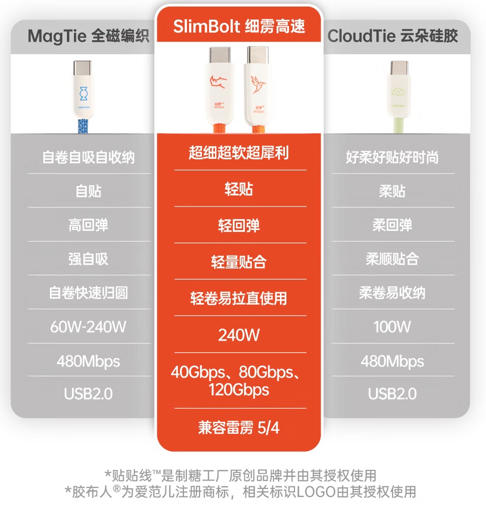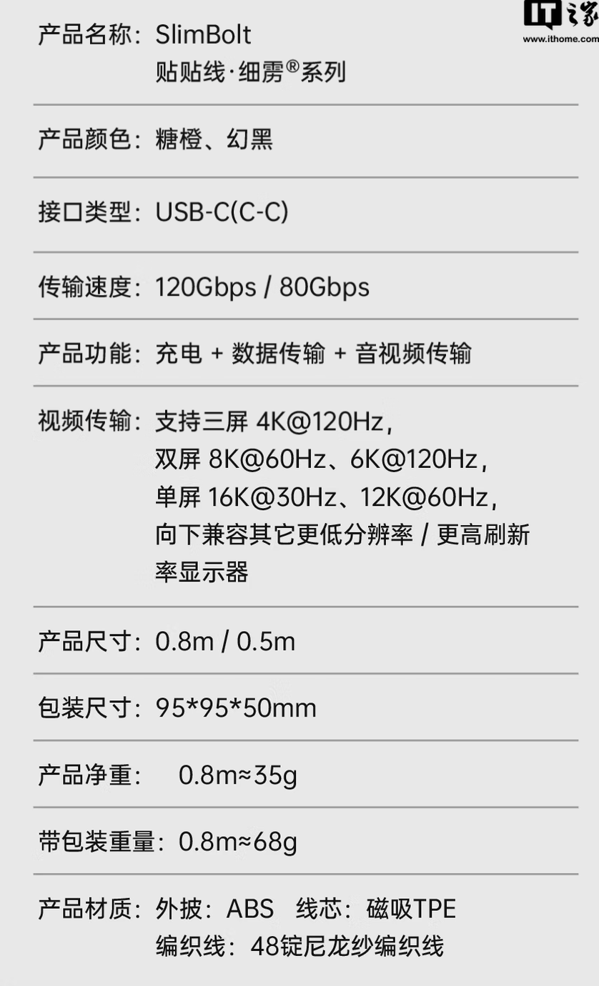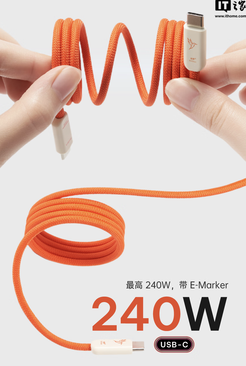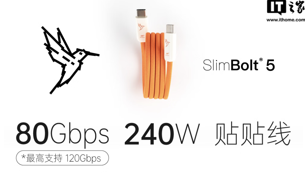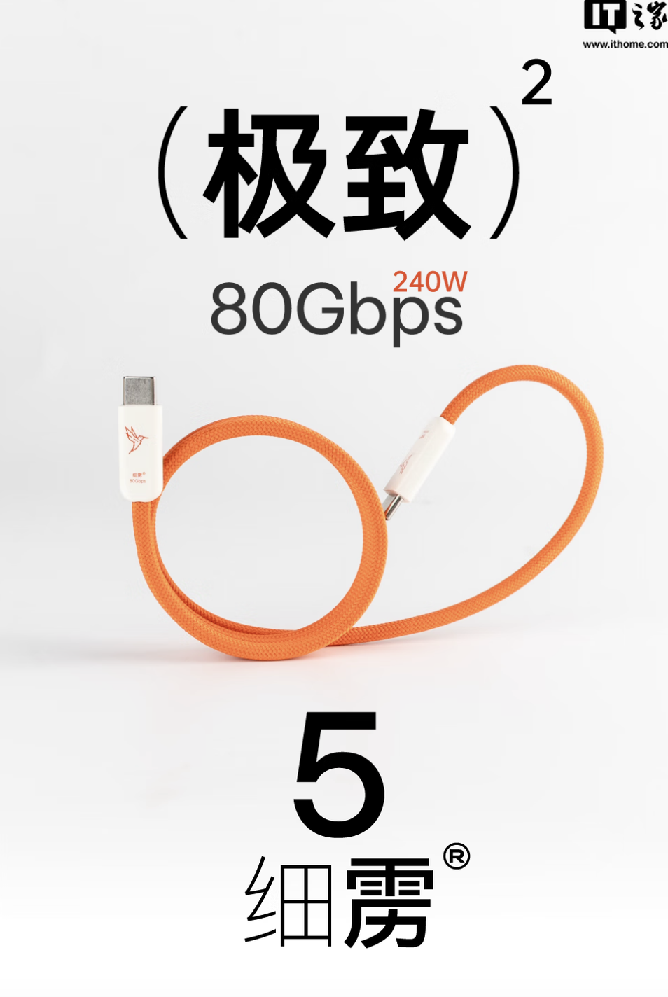 IT之家 1 月 18 日消息,制糖工厂现已为其“贴贴线”数据线新增“兼容雷电 5”版本,长度为 0.8 米,暂时仅提供橙色一种配色,支持 80Gbps 传输速率、240W PD 3.1 充电,定价为 199 元。
